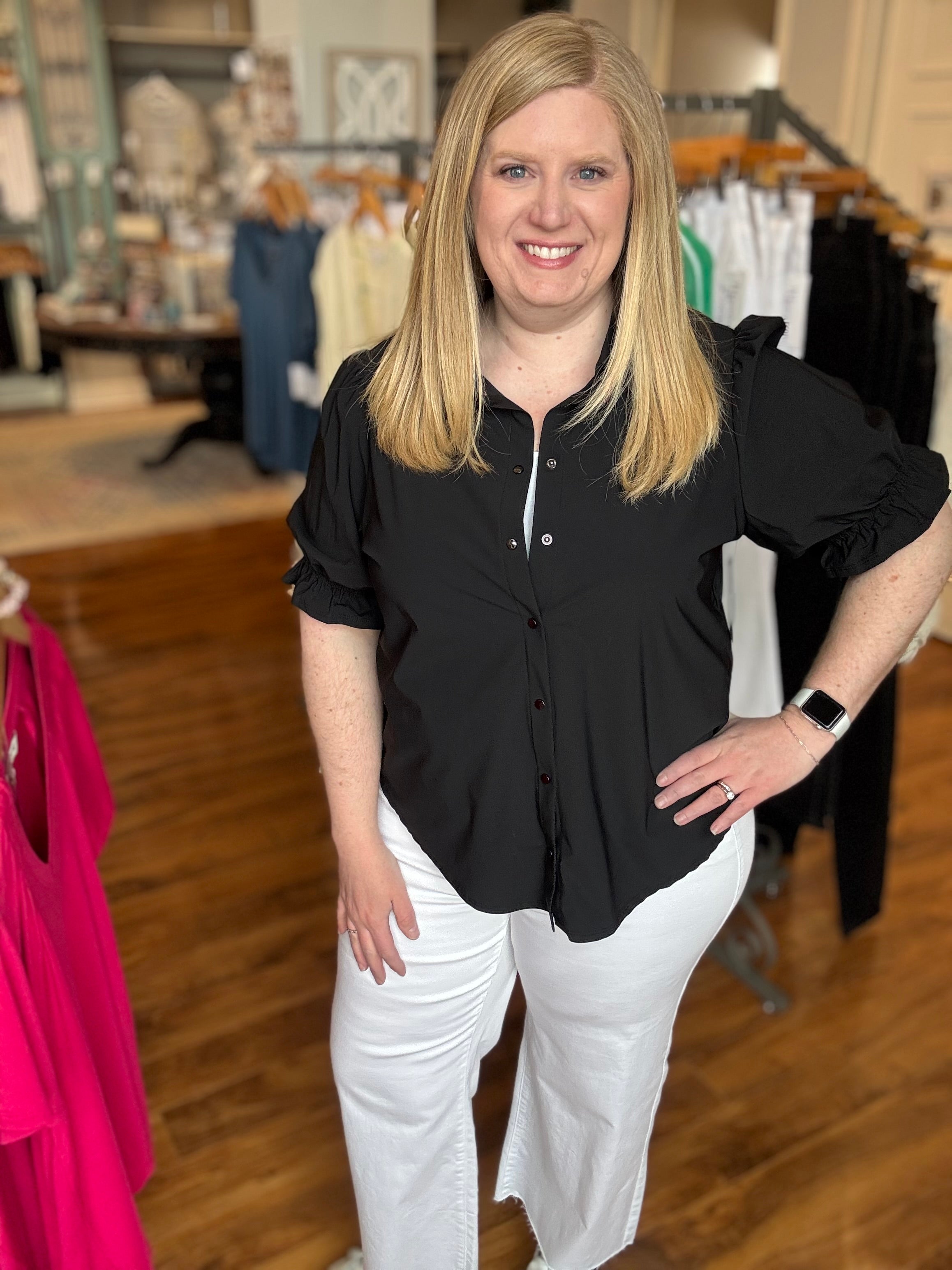 Trim Detail Ruffle Sleeve Woven Top