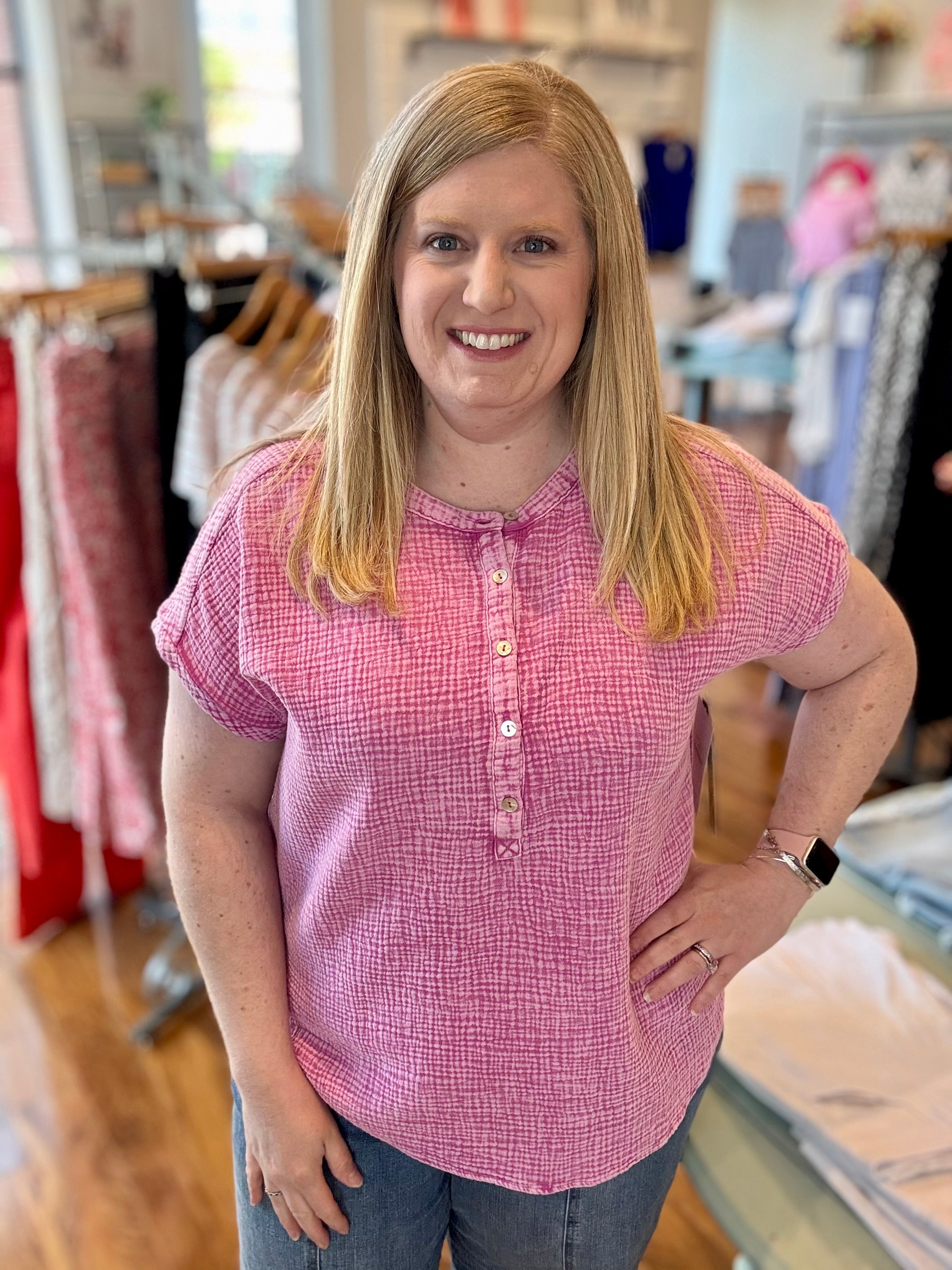 Button Front Textured Hooded Top