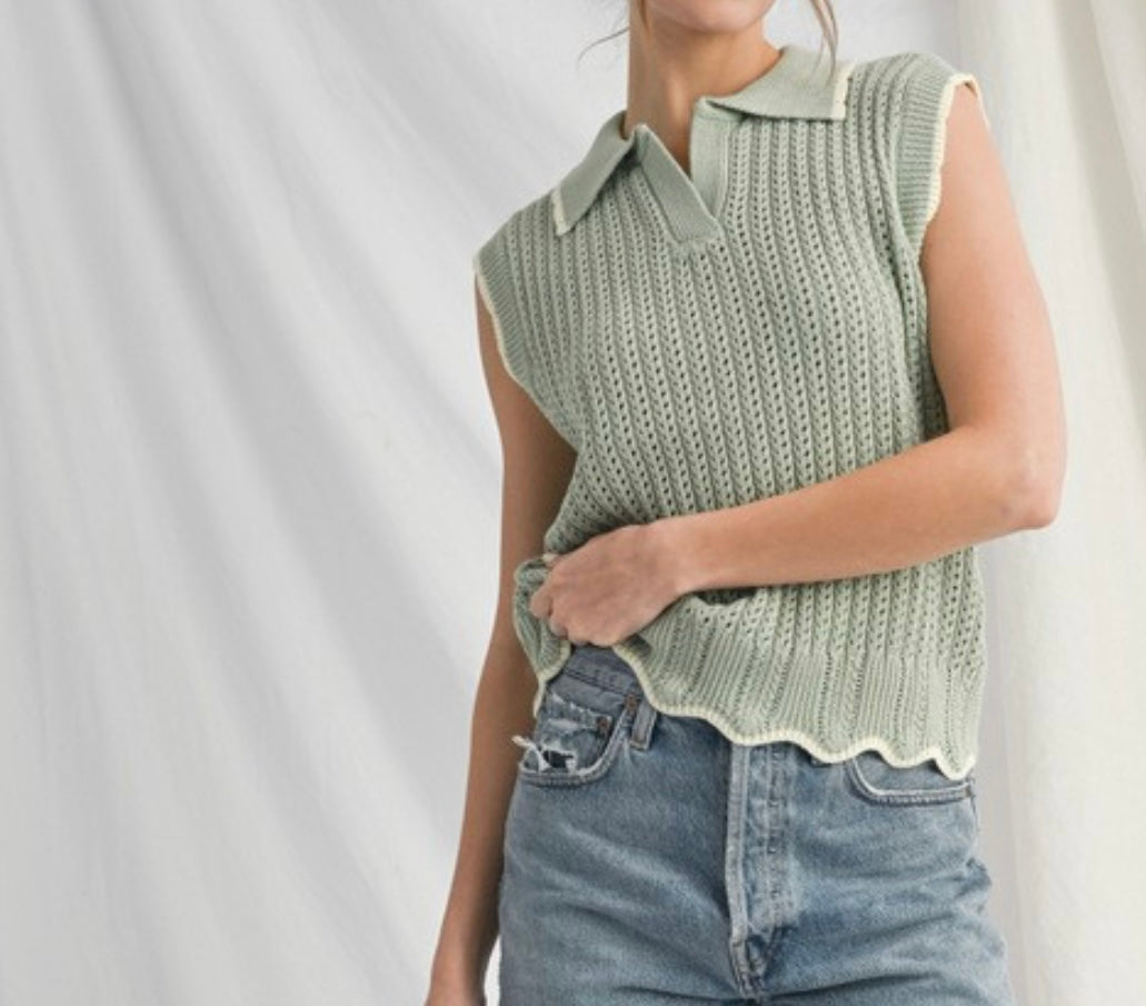 Collared Scallop Hem Sleeveless Sweater
