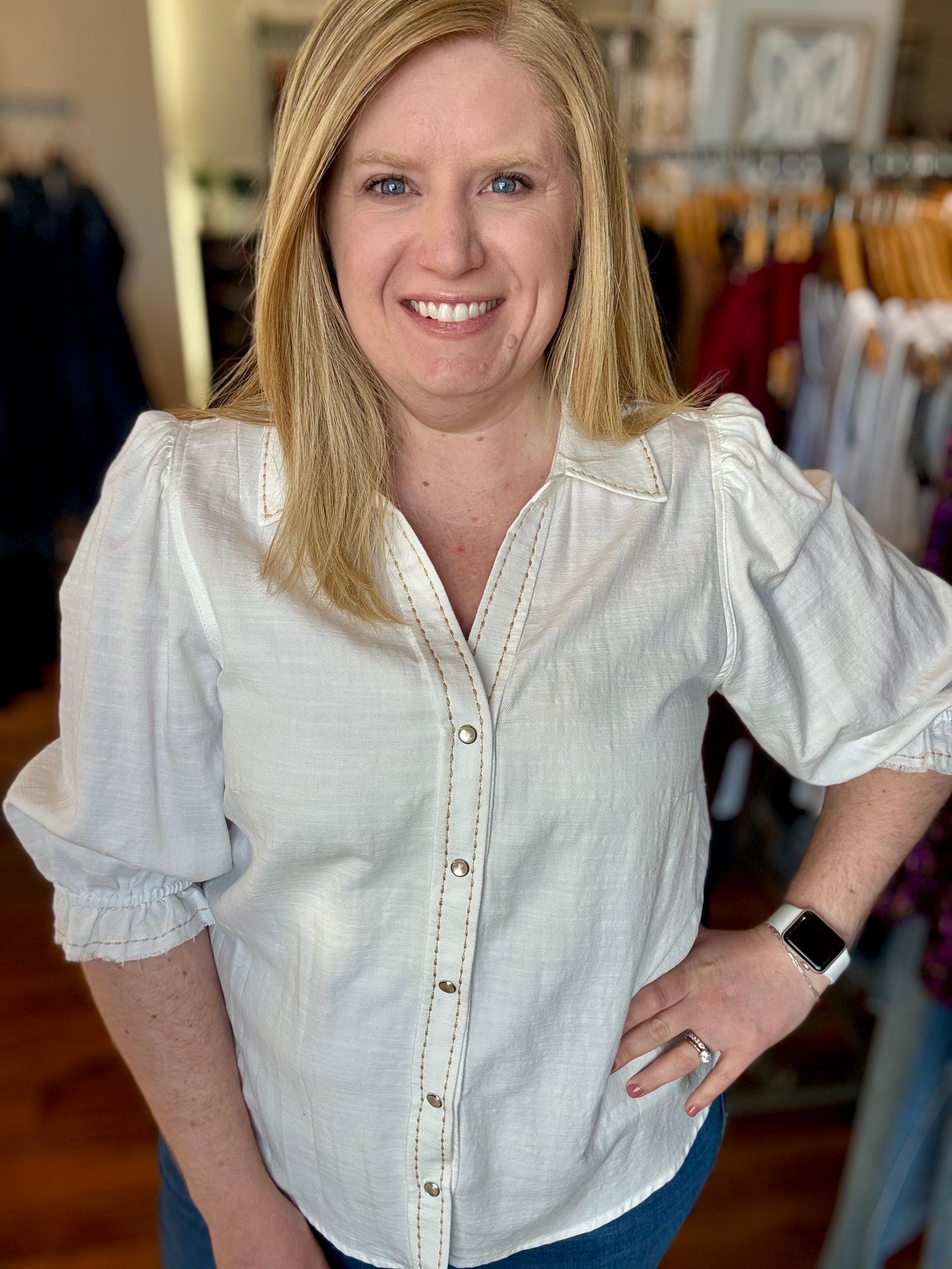 Elbow Sleeve Snap Button Down Woven Top