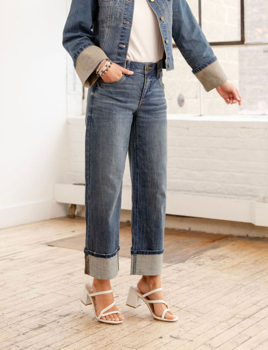 Make a statement with these stylish cropped denim jeans featuring a chic fixed cuff detail. With a 27" inseam, 20" leg opening, and a flattering 10" rise, this pair combines comfort and a modern silhouette. The medium-wash denim adds a timeless appeal, while the bold cuff design brings a fresh, contemporary touch. Perfect for pairing with heels, sneakers, or sandals, these jeans are versatile enough for casual or elevated looks. A must-have for anyone seeking a balance of effortless style and standout details!
