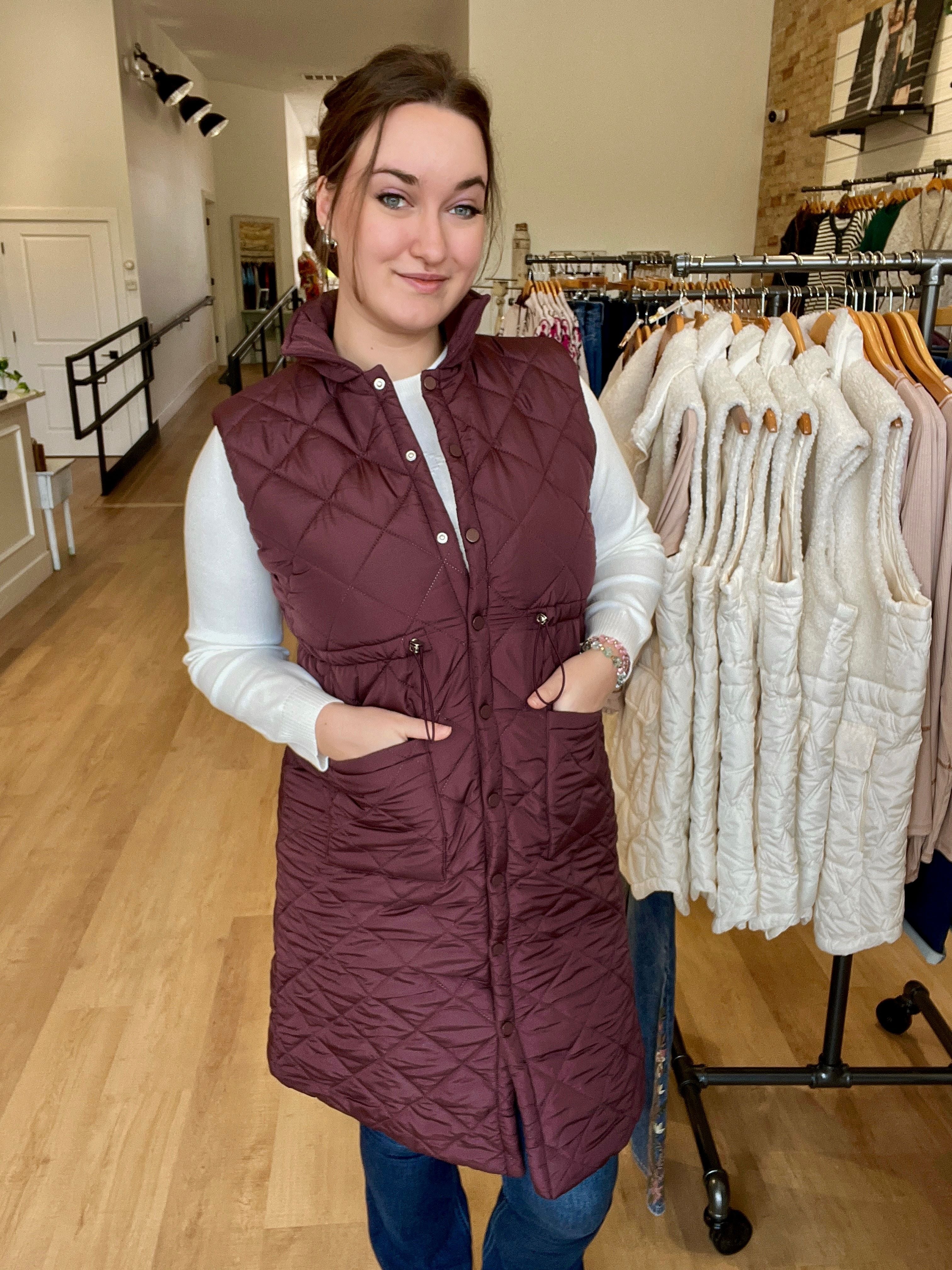Long Puffer Vest w/Drawstring Waist and Pockets