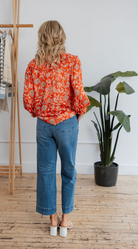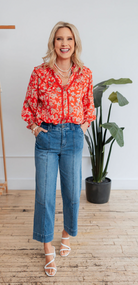 Brighten up your wardrobe with this vibrant red floral blouse. Featuring an intricate white floral print, this top includes playful ruffle details along the neckline and shoulders, adding a touch of romantic charm. The lightweight fabric and relaxed fit ensure comfort, while the button-down front provides versatility for styling. Perfect for pairing with your favorite jeans or trousers, this blouse effortlessly combines bold color and feminine flair for any occasion.