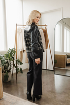 This sleek and stylish Shirt Jacket with contrasting fabric, where sophistication meets casual comfort. Crafted with meticulous attention to detail, this jacket boasts a unique fusion of faux leather and a black oatmeal plaid fabric. Its shirt-style design offers a relaxed yet refined silhouette, perfect for layering over your favorite ensemble. 23-1/2" Front body length. Boxy fit. Contrast sleeves. Button front closure. Two front chest flap pockets. Cuff detail with button closure. Windowpane plaid knit. Polyester, Rayon, Spandex.